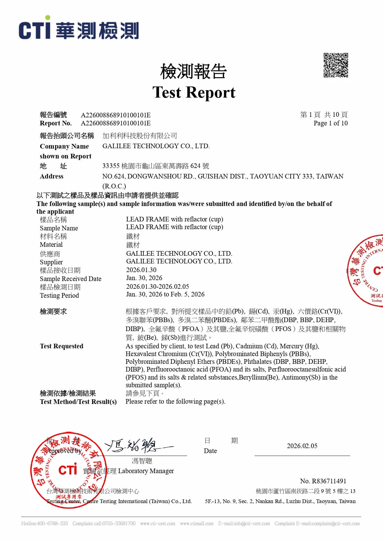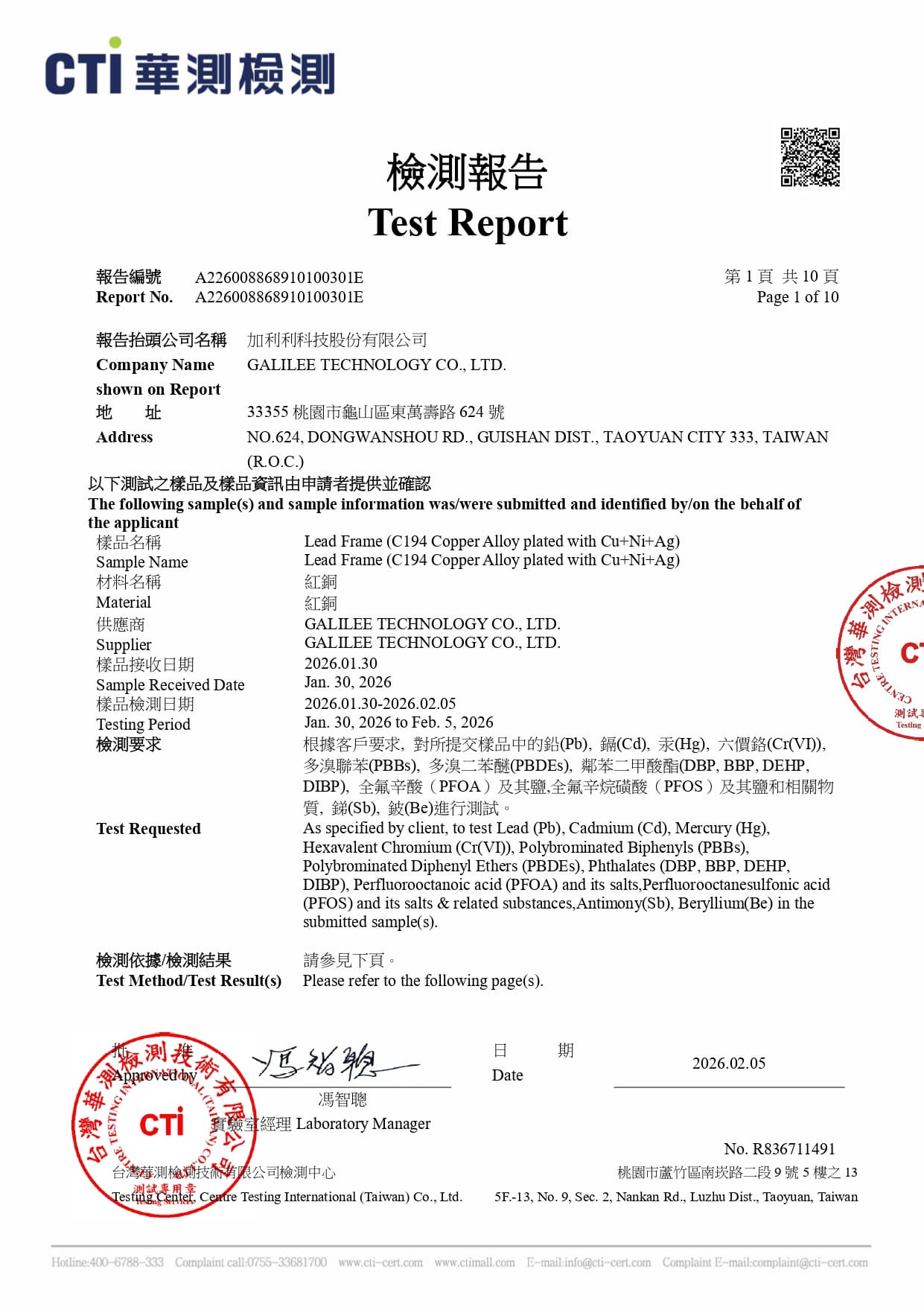 為了保障產品品質與使用者安全,本公司"每年"進行產品之有害物質檢測,並榮獲國際認可的第三方檢測機構(CTI)核發的合格報告。